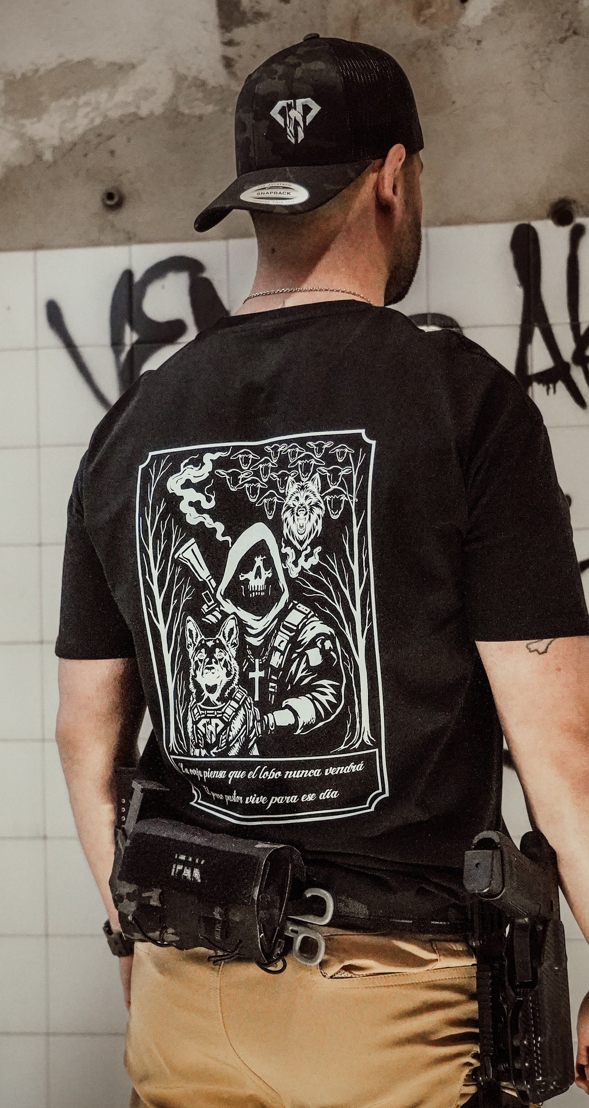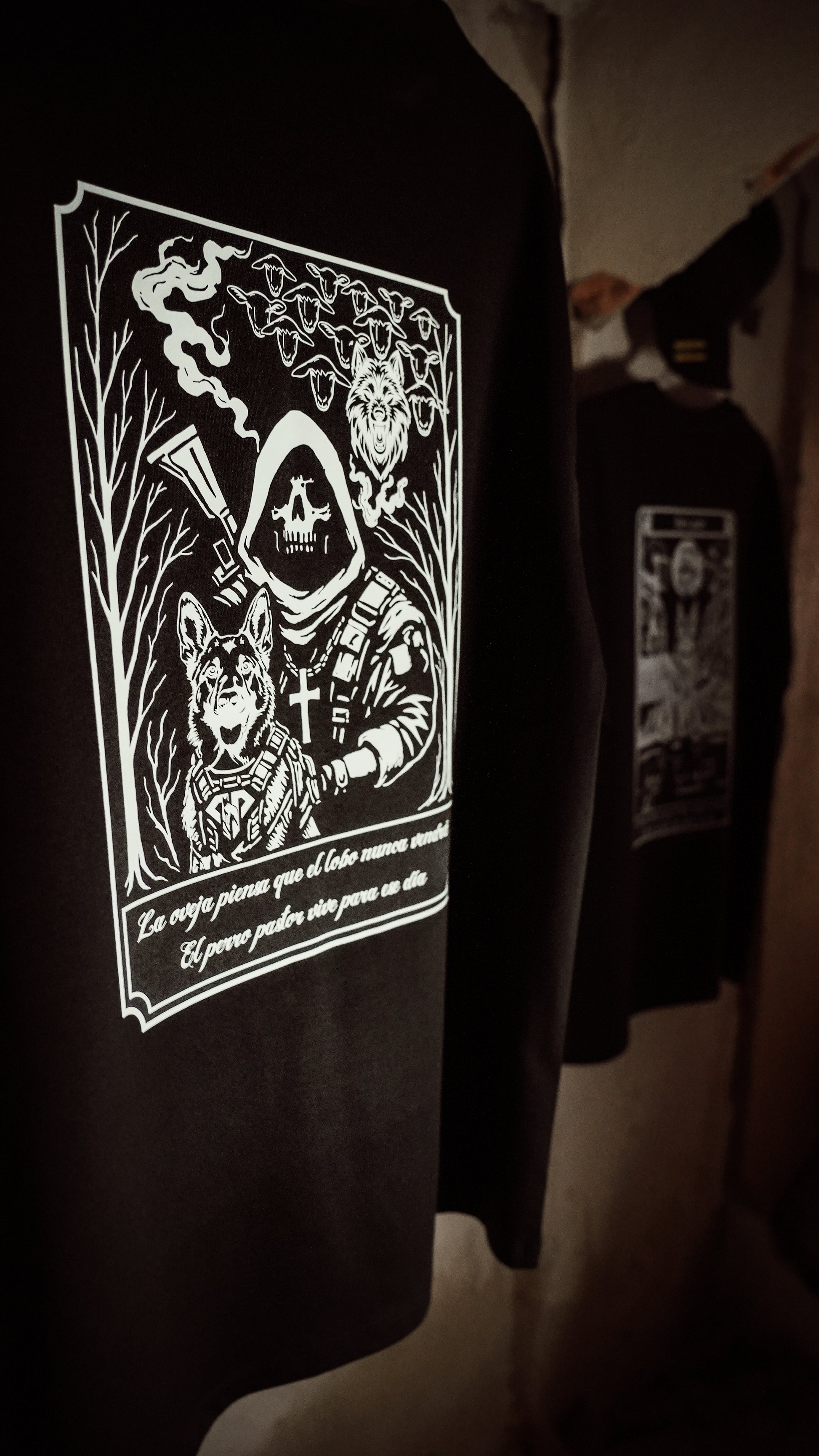 El diseño representa al perro pastor en primer plano, firme y vigilante. Al fondo, el lobo, las ovejas y la figura espectral armada —la muerte— recuerdan una verdad incómoda: alguien debe estar dispuesto a permanecer entre el peligro y el rebaño. Esa es la esencia del Protector. No busca reconocimiento, solo cumplir con su deber.