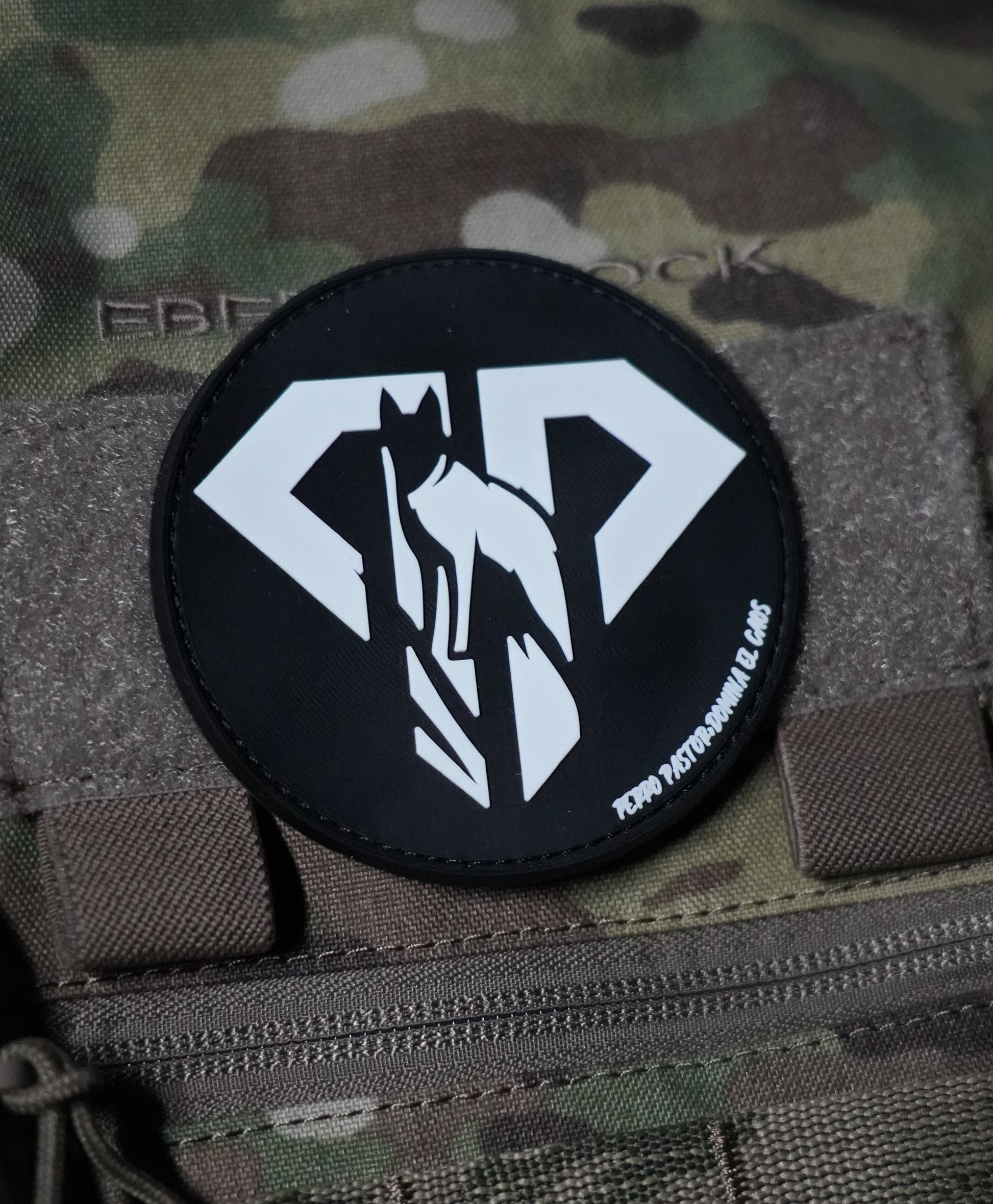 Parche de goma circular de 8 cm de diámetro, con fondo negro y el nuevo logo en blanco, acompañado en un lateral por la inscripción discreta Perro Pastor · Domina el Caos.